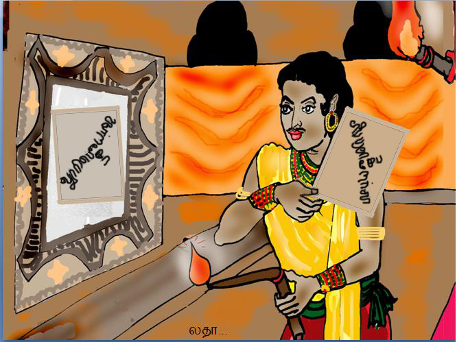 ‘இப்போது சுலபமாக இருப்பதுபோல் தெரிகிறது! தமிழைப் போலவும் இருக்கிறது. இல்லாதது போலவும் இருக்கிறது. தமிழைப் போலவே எழுத்து ‘ப’ இருக்கிறது! அடுத்து ‘ய’ போலவே இருக்கும் எழுத்தில் செங்குத்தாக இருக்கும் மூன்று கோடுகளுக்குமிடையே உள்ள இடைவெளி வேறுவிதமாக இருக்கிறது! தமிழில் உள்ள முதல் இரண்டு கோடுகளுக்கு, இடைவெளி சிறியதாகவும் மற்ற இரண்டிற்கும் உள்ள இடைவெளி பெரியதாகவும் இருக்கும். ஆனால் புதிரின் ‘ய’வின் இடைவெளிகள் தமிழுக்கு நேர் எதிராக இருக்கின்றன. ‘ப’ போன்றிருக்கும் எழுத்தின் அடுத்தது, ஓர் ஒற்றைக் கொம்பு போல் இருக்கிறது! ஆனால் கொம்பு வலப்புறம் ஆரம்பித்து இடது பக்கம் முடிவதுபோல் தென்படுகிறது! கொம்பு ‘ப’வின் இடப் பக்கத்திற்கு பதிலாக வலப்புறம் வேறு எழுதப்பட்டிருக்கிறது! தமிழின் சில எழுத்துக்களின் மூக்குக் கோடுகள் வலது பக்கத்தில் இருப்பது என்பது மரபு! ஆனால் இதில் காணப்படும் கோடுகள் இடது பக்கத்தில் எழுதப்பட்டிருக்கின்றன! ஒன்றும் விளங்கவில்லையே..’ என்று குழம்பி நின்றான் வந்தியத்தேவன்.
