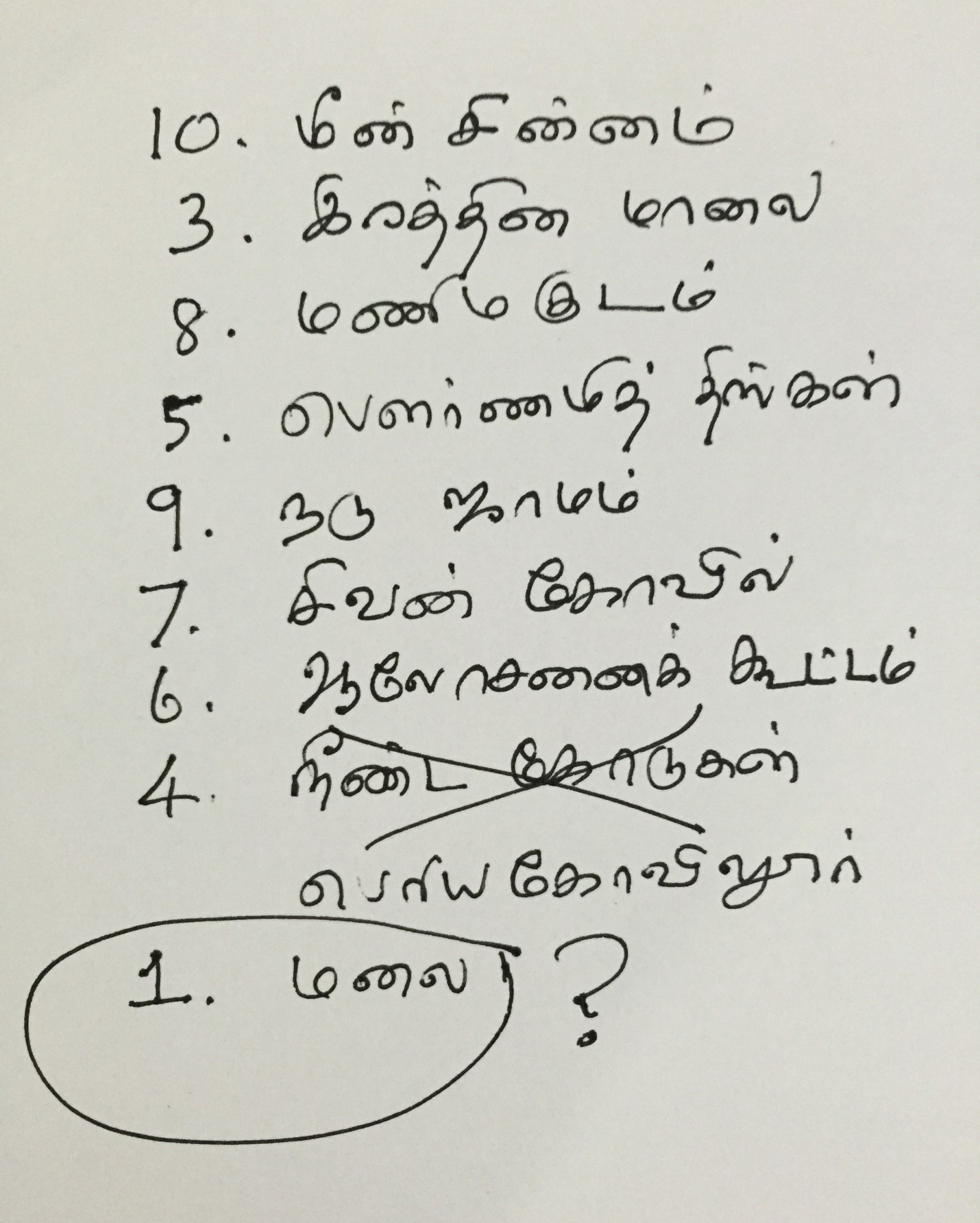சிவன் கோவிலுக்கு நாம் ஆறாம் இடத்தைத் தரலாம்! அடுத்ததாக ‘கூட்டம்’ சித்திரம் ஏழாவது இடத்தைப் பெறுகிறது’ என்றெல்லாம் ஆராய்ந்த வந்தியத்தேவனின் கை அவ்வப்போது பலகையில் வரிசைப்படுத்தியவைகளை எழுதிக் கொண்டிருந்தது. அவை கீழ்க் கண்டவாறு காணப்பட்டன: