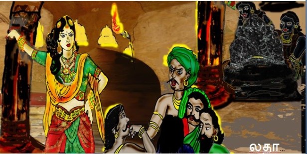 கையில் தீப்பந்தத்துடன் ஒருவன் அருகில் நின்று கொண்டிருந்தான். வந்தவர்கள் ஒவ்வொருவராக உள்ளே சென்று மறைந்து கொண்டிருந்தனர். கடைசியில் நின்று கொண்டிருந்தவனும் உள்ளே சென்று மாயமானான். பிறகு அங்கு அமைதி நிலவியது. நிலாவின் வெளிச்சம் மட்டும் அங்கு பரவியிருந்தது.
