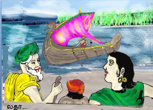 கந்தமாறனுக்கு விடை கூறி அனுப்பிய பிறகு இருவரும் நங்கூரம் பாய்ச்சி நின்ற கலத்திற்கு அழைத்துச் செல்ல ஓர் படகு அங்கு ஆயத்தமாக நின்று கொண்டிருந்தது பார்த்து அதை நோக்கிச் சென்றார்கள். இருவரும் படகில் ஏறினார்கள்.