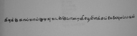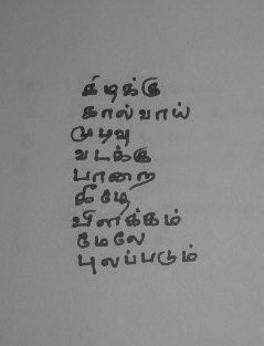 முதலில் ‘கி..ழ..க்..கு’ என்று தொடங்கி சொல்லிக்கொண்டே போனான். வந்தியத்தேவன் தரையில் குச்சியால் அவன் சொன்ன வார்த்தைகளை ஒன்றன்பின் ஒன்றாக எழுத ஆரம்பித்தான். இடை இடையே அவன் கண்டுபிடித்துச் சொன்ன வார்த்தைகள் கடைசியாக முடிவடைந்தன. வந்தியத்தேவன் எழுதிய வார்த்தைகள்..