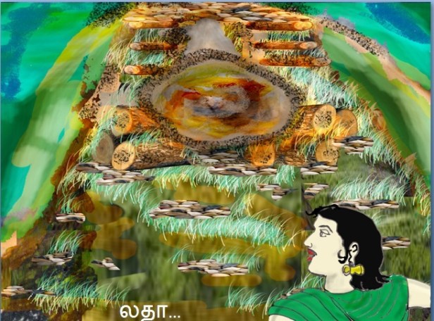 ஒருவழியாகக் கட்டைகள் எரிந்து முடிந்தன! ஒரே புகைப்படலம்! சிறிது நேரம் ஒன்றும் புலப்படவில்லை! கட்டைகள் எல்லாம் சாம்பலாகி இருந்தன.