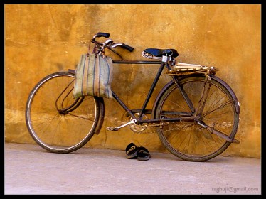 தேய்ந்த பிரேக்குகள், துருவேறிய வீல் கார்டு, பெடலில் தொங்கும் நடு ரப்பர்க் கட்டை, 45 டிகிரியில் வானம் பார்த்த மரக்கட்டை சீட்டு, வளைந்த ஹாண்டில் பார், வாய்பிளந்த பிரேக் லீவர்கள் – முதன் முதலில் இந்த சைக்கிளை ஓட்டிய பையனுக்கு இப்போது குறைந்தது ஐம்பது வயாதாகியிருக்கலாம்!