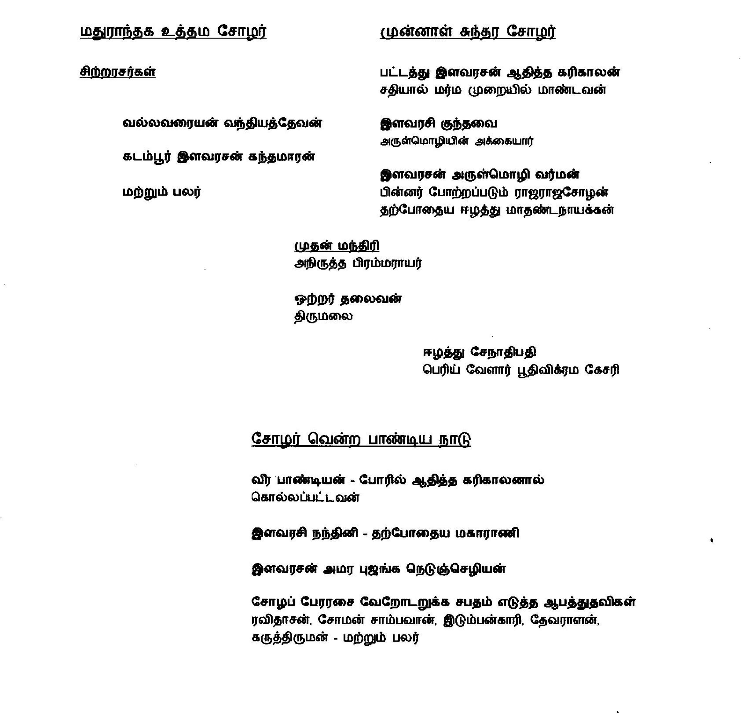 வேளார் “வந்தியத்தேவா! இது பொன்னான நேரம். வெளியில் நமது படை கூடியிருக்கிறது, எதனால் தெரியுமா? இன்றிலிருந்து சேனாதிபதி பதவியிலிருந்து நான் விடுதலையாகிறேன். நீ அதை ஏற்கப் போகிறாய். அதை இந்த நல்ல நாளில் அறிவிக்கத்தான் இந்த ஏற்பாடு” என்றார்.