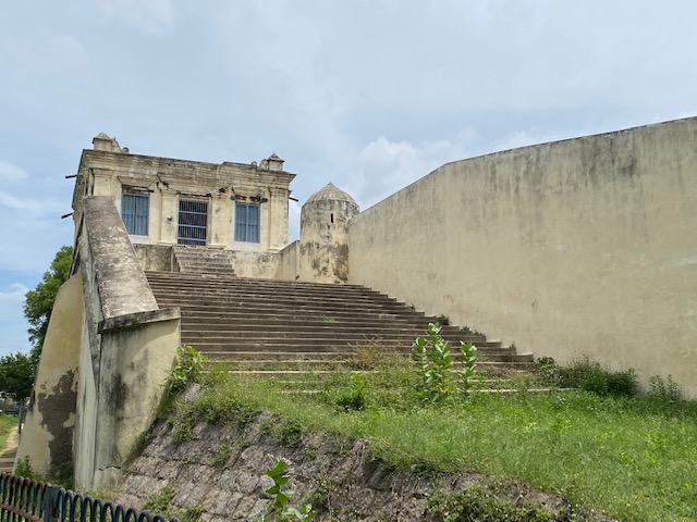 கோபி நிறப் பூச்சுடன், சுற்றிலும் புல்லும் செடிகளும் மண்டியிருக்க, இரண்டு பக்கமும் பத்து அல்லது பதினைந்து அதிக உயரமில்லாத படிகளுடன் நின்று கொண்டிருந்தது அந்தக் கட்டிடம். படிகளில் எல்லாம் சிறு செடிகள்! ஒரு ஆர்ச் வளைவுடன் வாயில் – உள்ளே செல்ல முடியாதபடி, கருங்கற் குட்டைத் தூண்கள். மேல் தளம் அந்தக் கால மூன்று ஜன்னல்கள் கொண்ட அறை போல இருந்தது. நான்கு மூலைகளிலும் சிறு மண்டபங்கள் கொண்ட கல் தளம். கட்டிடத்தைச் சுற்றி இரும்புக் கம்பிகளாலான தடுப்பு வேலி. அதை ஒட்டி, மர நிழலில் காலி பாட்டில்களும், பிளாஸ்டிக் கவர்களும் முந்தைய இரவுகளின் கதை சொல்லின!