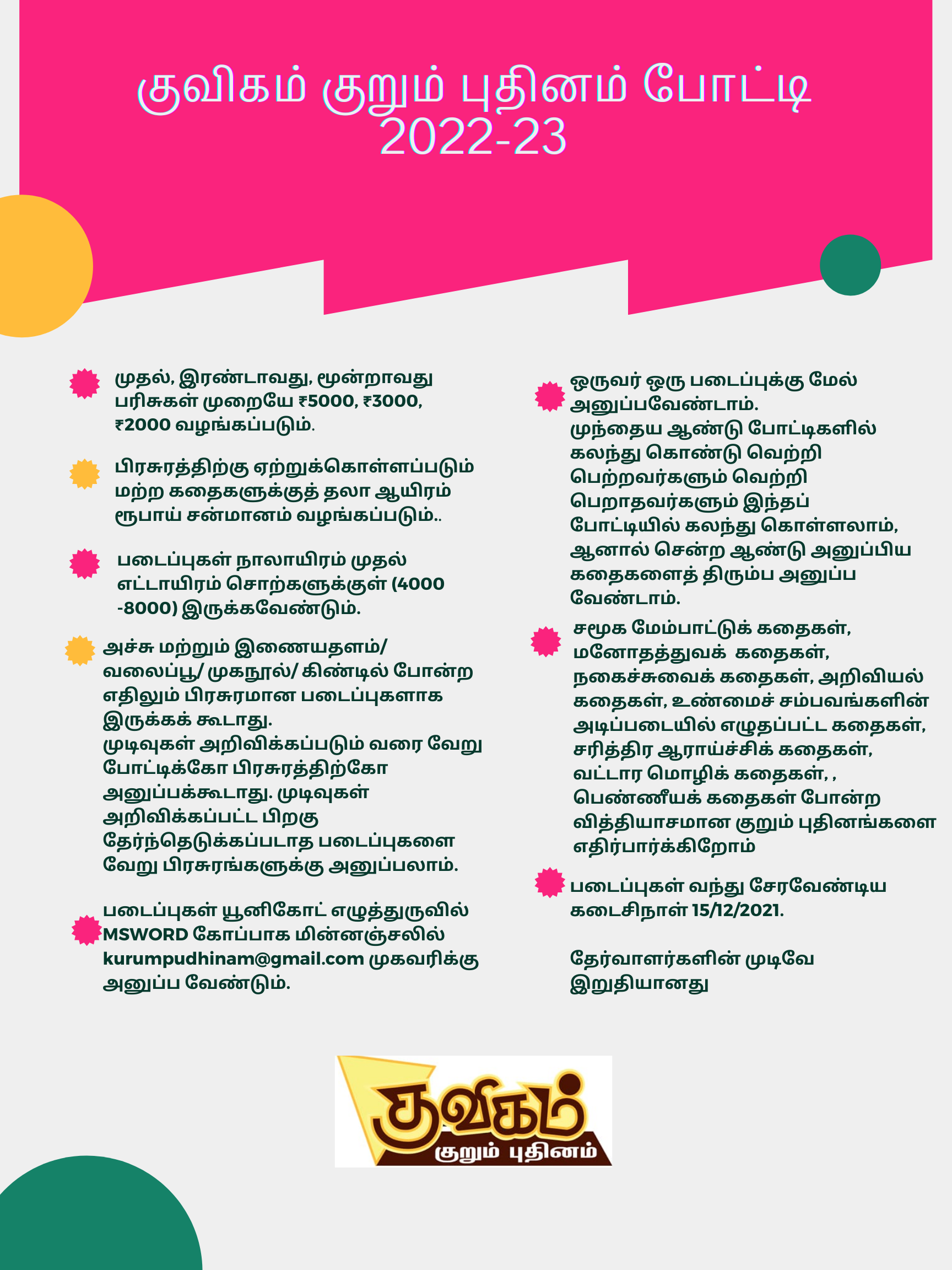 Uncategorized குவிகம் குறும் புதினம் போட்டி Date: October 15, 2021Author: sundararajan 0 Comments Rate this:Share this: Share on WhatsApp (Opens in new window) WhatsApp Share on Facebook (Opens in new window) Facebook Share on X (Opens in new window) X Like Loading...