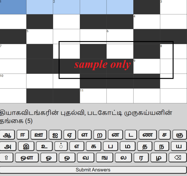 எண் குறிக்கப்பட்ட கட்டத்தில் கிளிக் செய்தால் குறிப்பு தெரிய வரும். அந்தக் கட்டங்களில் சரியான எழுத்துக்களை கொடுக்கப்பட்டுள்ள கீ போர்ட் மூலமே நிரப்பவேண்டும்.