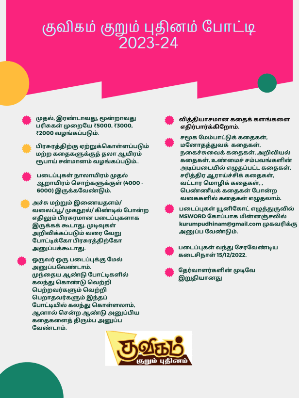 Uncategorized குவிகம் குறும் புதினப் போட்டி -2023-24 Date: October 15, 2022Author: sundararajan 0 Comments Rate this:Share this: Click to share on WhatsApp (Opens in new window) WhatsApp Click to share on Facebook (Opens in new window) Facebook Click to share on X (Opens in new window) X Like Loading...