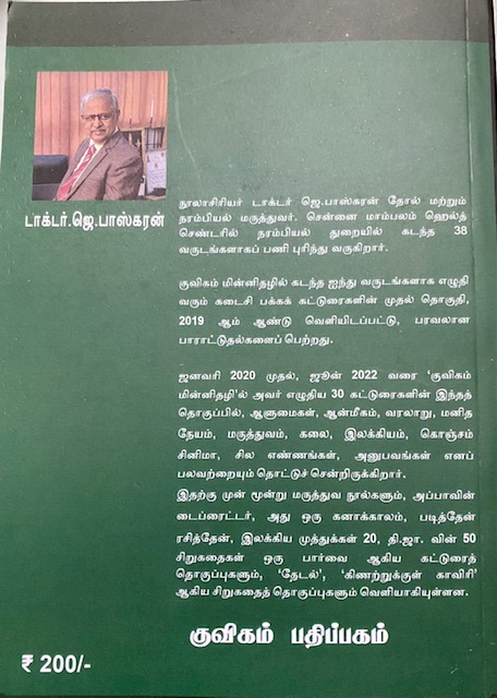 எழுத்தாளர், டாக்டர் ஜெ. பாஸ்கரன் குவிகம் மின்னூலில் ஜனவரி 2020 முதல் ஜூன் 2021வரை மாதாமாதம் எழுதிவந்த முப்பது கட்டுரைகளின் தொகுப்பாக இந்த நூல் வெளியாகியிருக்கிறது. ஒவ்வொன்றும் ஒவ்வொரு தலைப்பில் எழுதப்பட்டது. தான் பார்த்த, அனுபவித்த அனுபவங்களை மிக அழகாக வாசகர்களுடன் பகிர்ந்திருக்கிறார். சந்தித்த ஆளுமைகள், பயணித்த வெளியிடங்களின் விபரங்கள் என்று படிப்பவர்களுக்குச் சுவை குறையாமல் எழுதும் கலையை ஆசிரியர் நன்கு கற்றிருக்கிறார்.