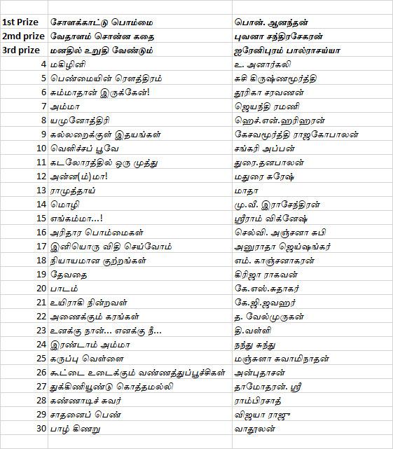 இவர்களைத் தவிர தேர்ந்தெடுத்த 11 கதைகளுக்கு ஆயிரம் ரூபாய் பரிசளிக்கத் திட்டமிட்டிருந்தோம்.