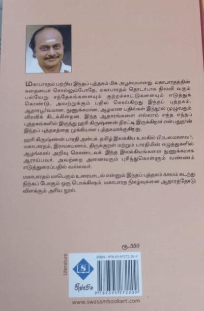 மகாபாரதம் ஒரு சமுத்திரம். அதன் ஆழ, அகலங்களை முற்றும் அளந்தறிந்தவர்கள் ஒருவரும் இருக்க முடியாது. அந்த மாபெரும் சமுத்திரத்தில் முத்தெடுக்கும் ஆர்வத்தில் மூழ்கித் துழாவி சிலமுத்துக்களோடு கரை சேர்ந்தவர்கள் சிலருண்டு. அந்தச் சிலரில் ஒருவர் ஹரி கிருஷ்ணன் அவர்கள். “தென்றல்” மின்நூலில் மகாபாரதம் குறித்துத் தொடர்ந்து எழுதி வருகிறார். அதன் முதல் தொகுப்புதான் இந்த நூல். இதில் முத்தான 103 முத்தான கட்டுரைகள் உள்ளன. அத்தனையும் அமுத ஊற்று. வாசகர்களின் நழுவிப் போன பல கேள்விகளுக்கு இதில் ஓரளவு பதில் நிச்சயம் கிடைக்கும். குறிப்பாக இளைஞர்கள், மாணவ, மாணவியருக்கு இந்நூல் பொக்கிஷம்.