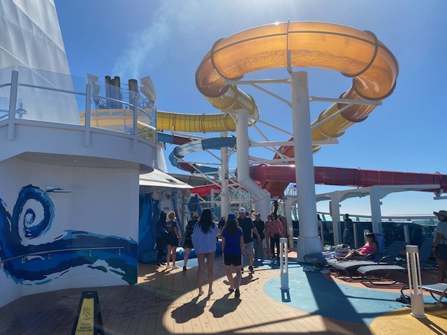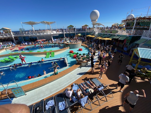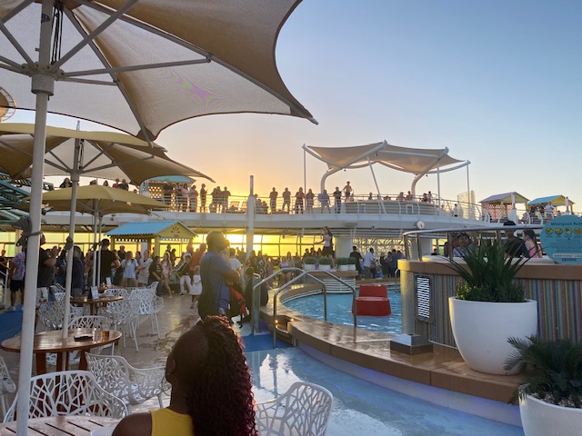 பதினோராம் டெக் – வானம் பார்த்தது! பெரிய நீச்சல் குளம், சுற்றிலும் சாய்ந்தவாறு படுத்துக்கிடக்க சாய்நாற்காலிகள், வேண்டுவோருக்கு இளநீரும், எலுமிச்சையும் கலந்த மதுபானங்கள், இலவசமாக எப்போதும் கோன் ஐஸ்கிரீம், பலவிதமான சிற்றுண்டிகள், குளிர்பானங்கள். சிறுவர்களுக்கான சின்ன நீச்சல் குளம்! ஓரிடத்தில் ஒரு மேடை – அதில் தினமும் காலை குறிப்பிட்ட நேரத்தில் உடற்பயிற்சி செய்தபடியே சொல்லிக்கொடுக்கும் பெண்மணி – எல்லா வயதினரும், பாடலை ரசித்தவாறு உடற்பயிற்சி செய்வது பார்ப்பதற்கு அழகு! எல்லோரும் பார்க்கும்படியாக ஒரு பெரிய எல் ஈ டி திரையில் (Jumbotron screen) சினிமா – உடற்பயிற்சி, கடல்வாழ் உயிரினங்கள், வீட்டுச் செல்லப் பிராணிகள் பற்றிய படங்கள், பழைய ஆங்கிலப் படங்கள் (நான் பார்த்தது ‘அப்பாஸ்’) என நாள் முழுதும் ஓடிக்கொண்டிருக்கும்! பகலில் சூரிய ஒளியுடனும், இரவில் நிலவொளியுடனும், கடற்காற்றின் சுகத்துடன் சாய்வு நாற்காலியில் மணிக்கணக்கில் மயங்கிக்கிடக்கும் அரைகுறை ஆடை மனிதர்கள் – பாசாங்குகளை உதிர்த்து, தன்னுலகில் தனித் தனியாக வாழும் கூட்டத்தினர்! சிறிது தவறினாலும், கால் இடறி படுத்திருக்கும் நபர் மேல் விழுந்துவிடும் அபாயம் இருந்தது! மறக்க முடியாத டெக்!