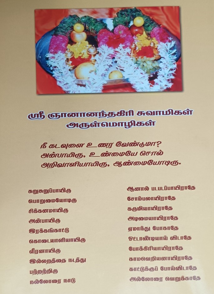 புத்தகத்தின் பின்னட்டையில் ஸ்ரீ ஞானானந்தகிரி சுவாமிகளின் அருள் மொழிகளை வழங்கி இருக்கிறார்கள். மிகவும் எளிமையாகத் தோன்றினாலும், இந்த அருள்மொழிகள் மனதில் வைத்து போற்றப்பட வேண்டியவை. வாழ்வியலாக மாற வேண்டியவை.