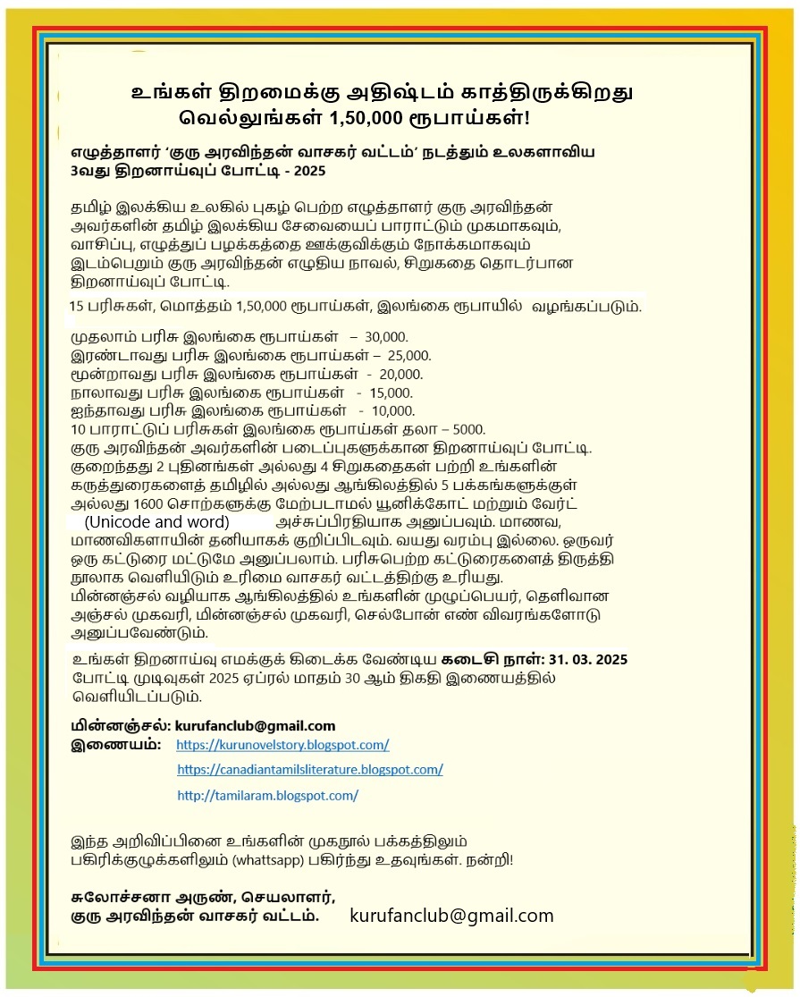 குரு அரவிந்தன் அவர்களின் படைப்புகளுக்கான திறனாய்வுப் போட்டி. குறைந்தது 2 புதினங்கள் அல்லது 4 சிறுகதைகள் பற்றி உங்களின் கருத்துரைகளைத் தமிழில் அல்லது ஆங்கிலத்தில் 5 பக்கங்களுக்குள் அல்லது 1600 சொற்களுக்கு மேற்படாமல் யூனிக்கோட் மற்றும் வேர்ட் (Unicode and Word) அச்சுப்பிரதியாக அனுப்பவும். மாணவ, மாணவிகளாயின் தனியாகக் குறிப்பிடவும். வயது வரம்பு இல்லை. ஒருவர் ஒரு கட்டுரை மட்டுமே அனுப்பலாம். பரிசுபெற்ற கட்டுரைகளைத் திருத்தி நூலாக வெளியிடும் உரிமை வாசகர் வட்டத்திற்கு உரியது.