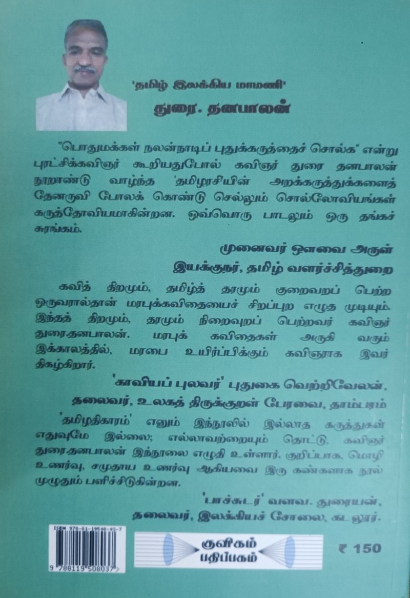 “பொதுமக்கள் நலன் நாடிப் புதுக்கருத்தைச் சொல்க” என்று புரட்சிக் கவிஞர் கூறியது போல் கவிஞர் துரை.தனபாலன் நூறாண்டு வாழ்ந்த தமிழரசியின் அறக்கருத்துக்களைத் தேனருவி போலக் கொண்டு செல்லும் சொல்லோவியங்கள் கருத்தோவியமாகின்றன. ஒவ்வொரு பாடலும் ஒரு தங்கச் சுரங்கம்”.