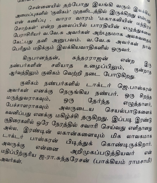 சுவாரஸ்யமான புத்தகம். குவிகம் பற்றியும், அதன் செயல்பாடுகள் பற்றியும் பாராட்டி எழுதியுள்ளார் ராணிமைந்தன். (பக்கம் 190). அவர் சந்தித்த ஆளுமைகள், அவர்களுடன் ஆன அனுபவங்கள் சொல்லும் செய்திகள் எல்லாம் அனைவரும் வாசித்து மகிழத்தக்கவை மட்டுமல்ல, வாழ்க்கையில் கடைபிடிக்க வேண்டிய வாழ்வியல் அனுபவங்கள்!