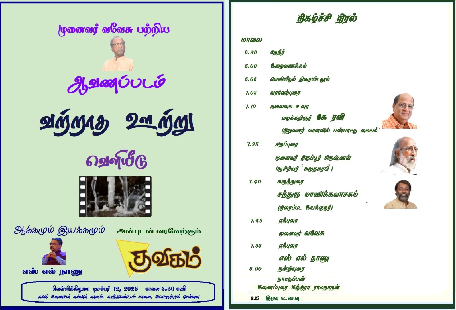 ஆவணப்பட வெளியீட்டு விழா 12.12.25 அன்று நூற்றுக்கும் மேற்பட்ட நண்பர்கள் நலம் விரும்பிகள் முன்னிலையில் வானவில் ரவி அவர்கள தலைமையுரை கூற, திருப்பூர் கிருஷ்ணன் அவர்கள் சிறப்புரை வழங்க, சந்துரு மாணிக்கவாசகம் அவர்கள் கருத்துரை வழங்க, வந்திருந்தவர் அனைவரும் வாழ்த்துரை வழங்க வ வே சு அவர்களின் ஆவணப்படம் “வற்றாத ஊற்று” கோலோகலாமாக வெளியிடப்பட்டது.