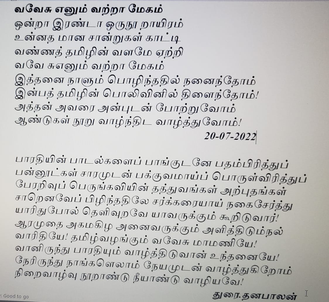 அவருடைய மாணாக்கனாக நான்கு ஆண்டுகளுக்கு மேல் நான் தொடர்ந்து வருவதும் எனது பெரும் பாக்கியமே ! என்னை புடம் போட்டு புடம் போட்டே மென்மேலும் நல்லமனிதனாக மாற்றிக்கொண்டே வரும் என் ஞானகுரு வற்றவே வற்றாத ஜீவநதியான வவேசு அவர்களுக்கு என் மனமுவந்த வாழ்த்துக்கள்.