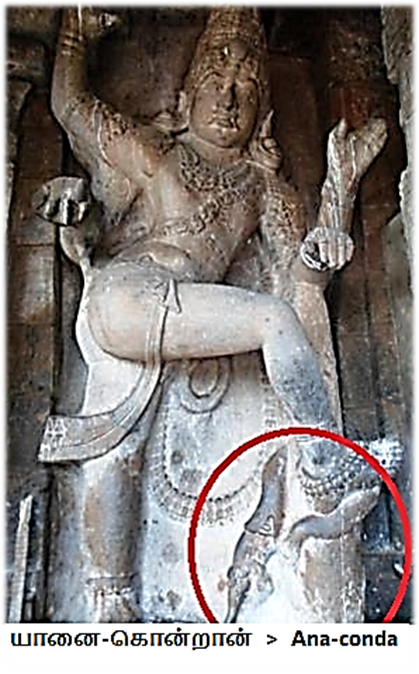 யானைகொண்டான் —> ஆனைகொண்டான் —> ஆனகொண்டா —> Anaconda அனகொண்டா என்று மறுவியுள்ளது.