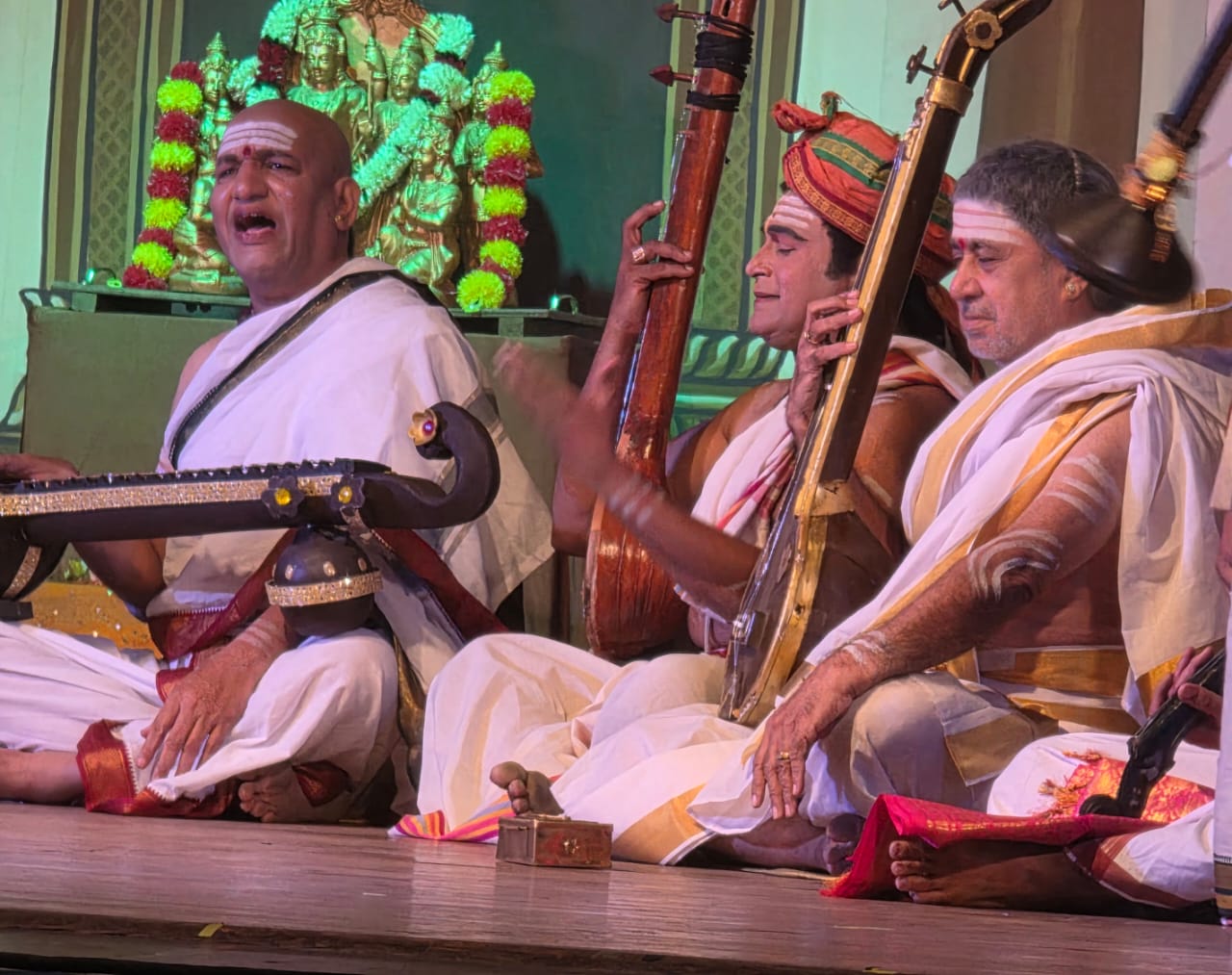 இதில் ஸ்ரீ சியாமா சாஸ்திரிகள் தான் மூத்தவர் என்பதால் ஸ்ரீ தியாகராஜரின் பெண் சீதம்மா அவரை பெரியப்பா என்று உரிமையோடு அழைப்பதும், ஸ்ரீ சியாமா சாஸ்திரிகளின் மகன் சுப்பராயன் ஸ்ரீ தியாகராஜரை சித்தப்பா என்றழைப்பதும் அந்த உறவில் நெருக்கத்தை ஏற்படுத்தி கேட்கவே இனிமையாக இருக்கிறது. கதையில் வரும் சந்தர்ப்பங்களுக்கு தகுந்தாற்போல ஆங்காங்கே கீர்த்தனைகள் அவர்கள் பாடுவது போல அமைக்கப்பட்டுள்ளன. நாடகம் மற்றும் சங்கீதம் இரண்டிலும் பிரியமுள்ளவர்களுக்கு இந்த நாடகம் செவிக்கும் கண்களுக்கும் ஒருங்கே களிப்பூட்டுகிறது. சில கீர்த்தனைகள் மேடையில் பாடப்படும்போது, அவையோர்கள் குறிப்பாக மூத்த தலைமுறையினர் கூடவே கீர்த்தனை வரிகளை உணர்சி வசப்பட்டு பாடுவதையும் பார்க்க முடிந்தது. குறிப்பாக ஸ்ரீ தியாகராஜர் உஞ்சவிருத்தி எடுக்கும்போது பாடும் ‘ஸ்ரீ ராம ஸ்ரீ ராம ஸ்ரீ மனோகராம’. ‘கஞ்சதளாயதாக்ஷி, ‘மீனாக்ஷி மேமுதம்’ போன்ற கீர்த்தனைகளை நிறைய ரசிகர்கள் தாளம் போட்டுக் கொண்டு பரவசமாக பாடினார்கள். ஸ்ரீ முத்துஸ்வாமி தீக்ஷிதர் வாயாலேயே அவர் ஹிந்துஸ்தானி, மற்றும் மேற்கத்திய இசை பயில கற்றுக் கொண்ட சம்பவங்களை சொல்லியிருப்பதும், அவர் அந்த பாடல்களை பாடிக் காட்டுவதும் ரசிகர்களை ஆரவாரம் செய்ய வைத்தது.