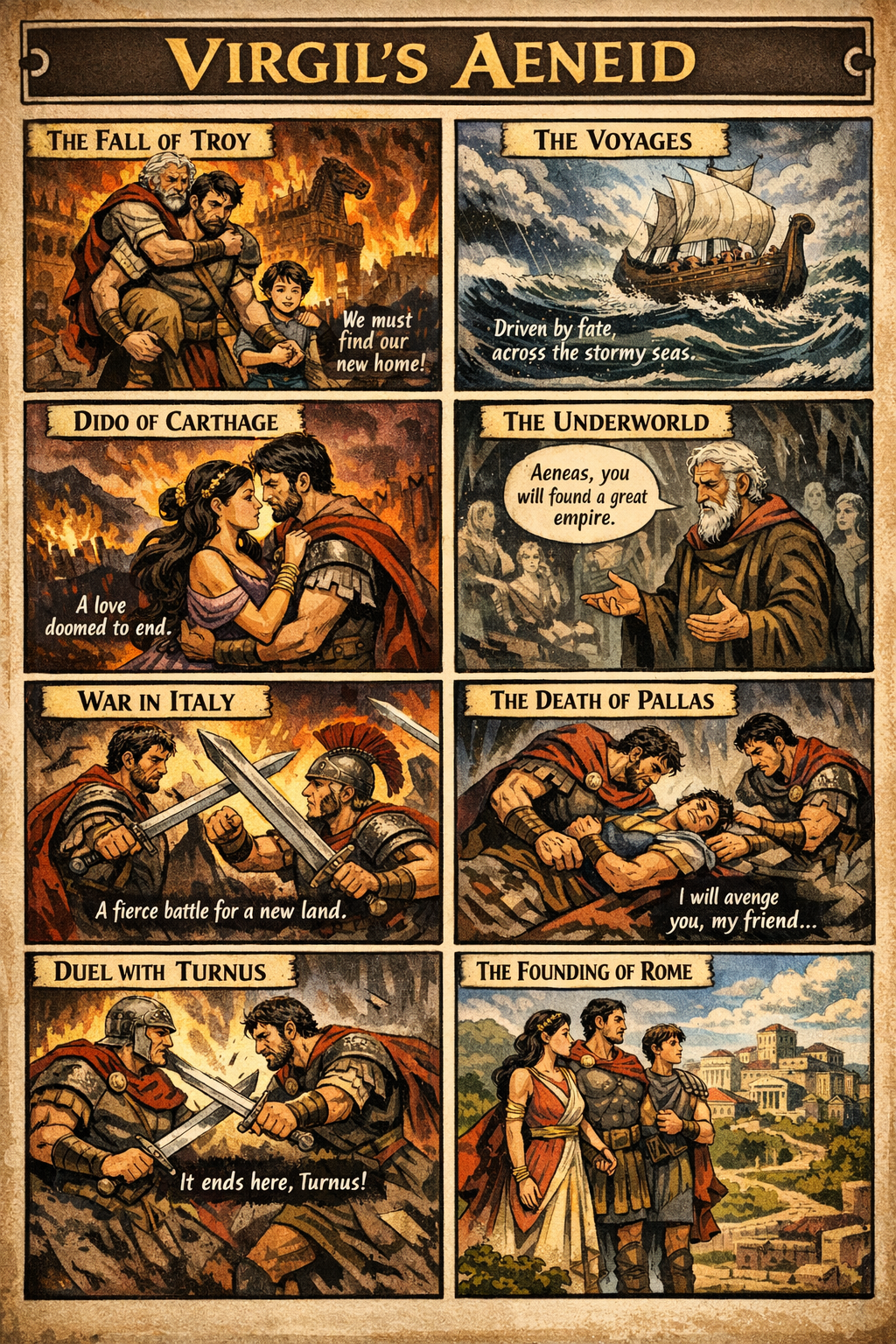 வர்ஜில் 12 புத்தகங்கள் கொண்ட உலகப்புகழ்பெற்ற ஏனிட் என்ற மாபெரும் இதிகாசத்தை இப்படித்தான் முடித்திருப்பார்.