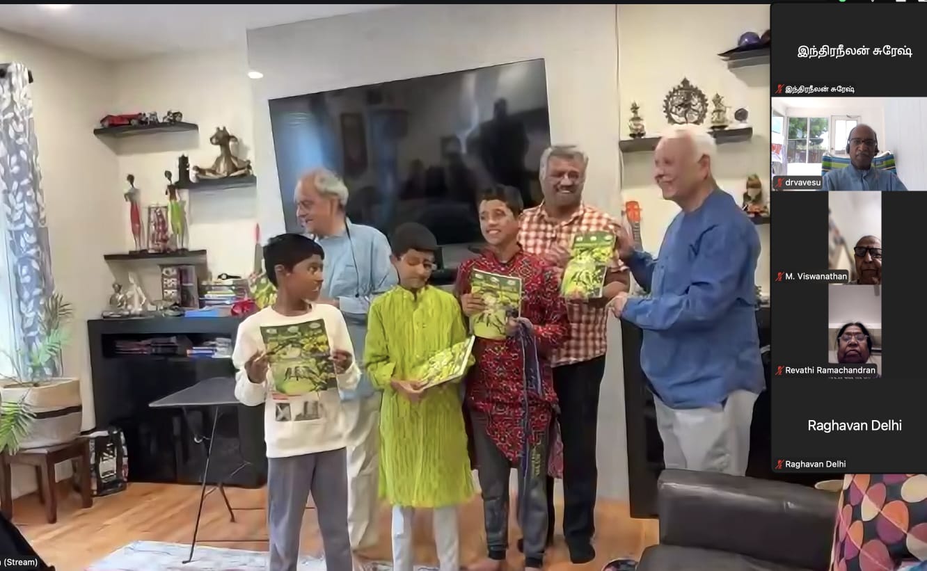 சியேட்டில் இலக்கிய மாலை அமைப்பாளர் குரு பிரசாத் அவர்கள் வசந்த மலரை வெளியிட குழந்தைகள் மூவர் பெற்றுக்கொண்டனர்.